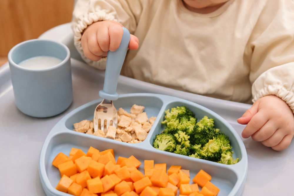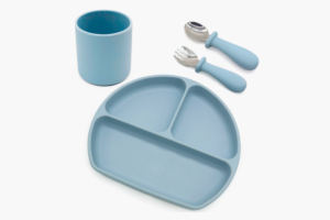 Platos, vasos y cubiertos diseñados para facilitar la alimentación y fomentar la autonomía del bebé.