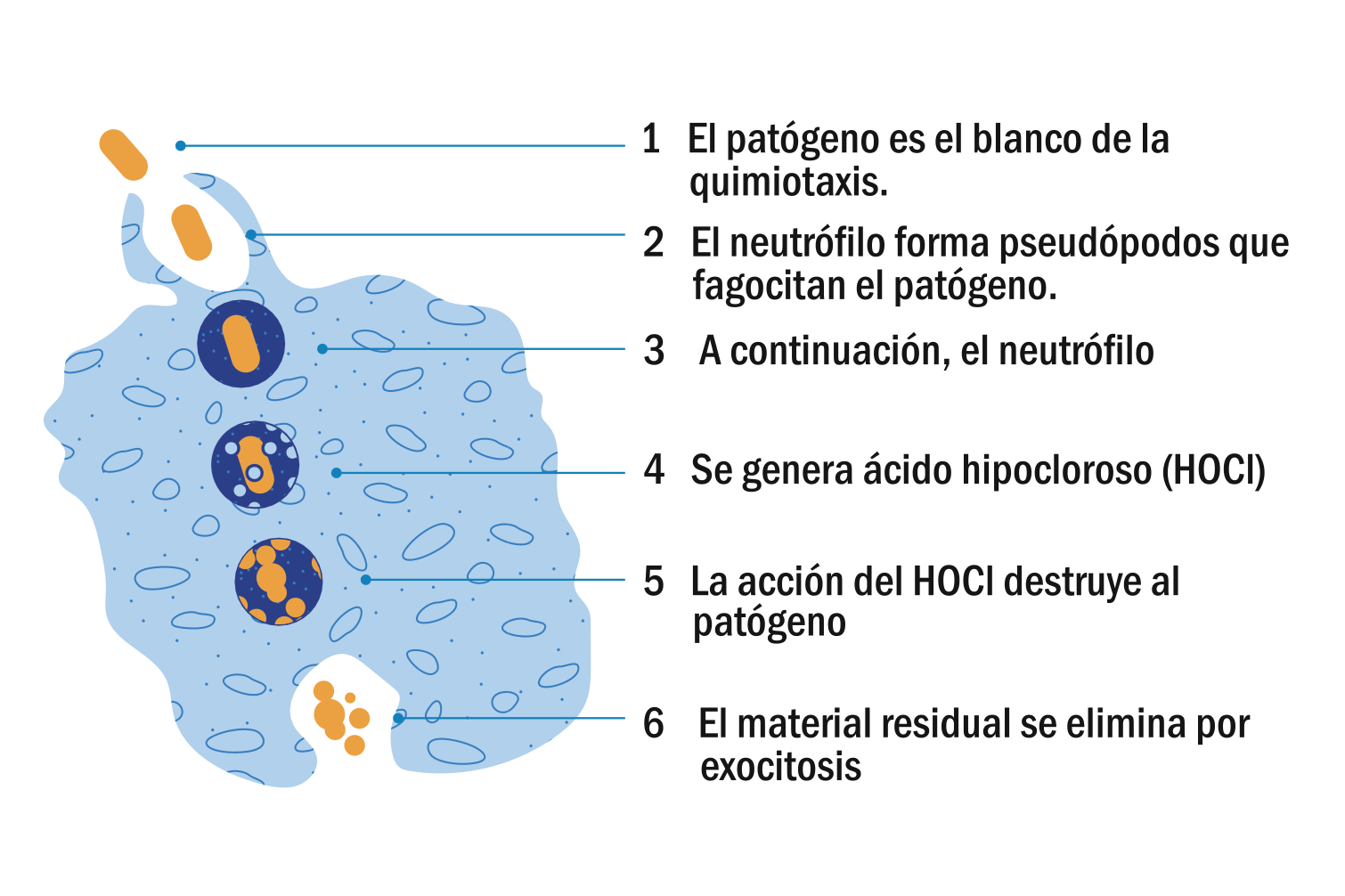 Cuando una bacteria entra al organismo, el sistema inmune responde produciendo ácido hipocloroso (HOCl), una sustancia que destruye rápidamente a los patógenos sin dañar las células sanas.